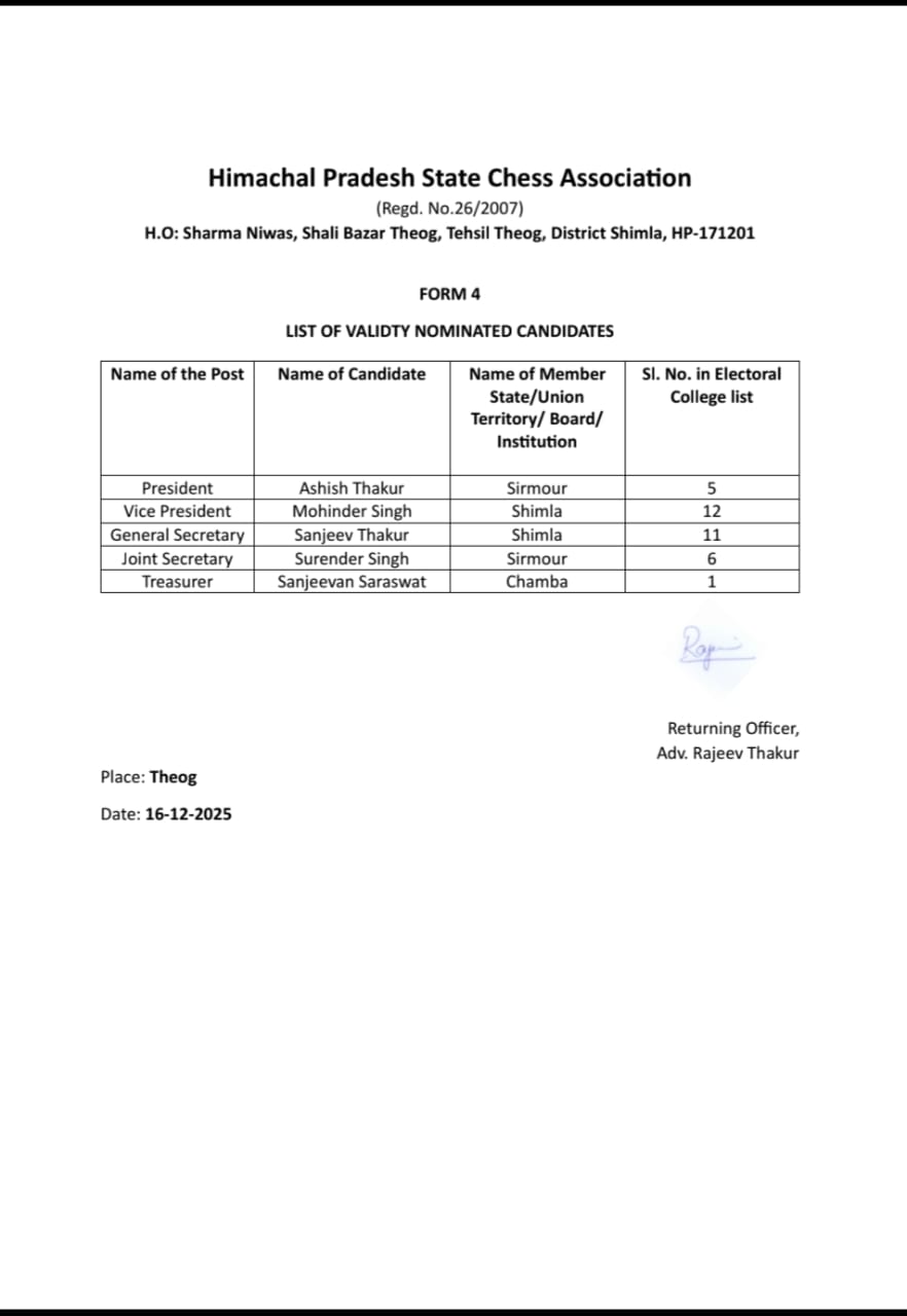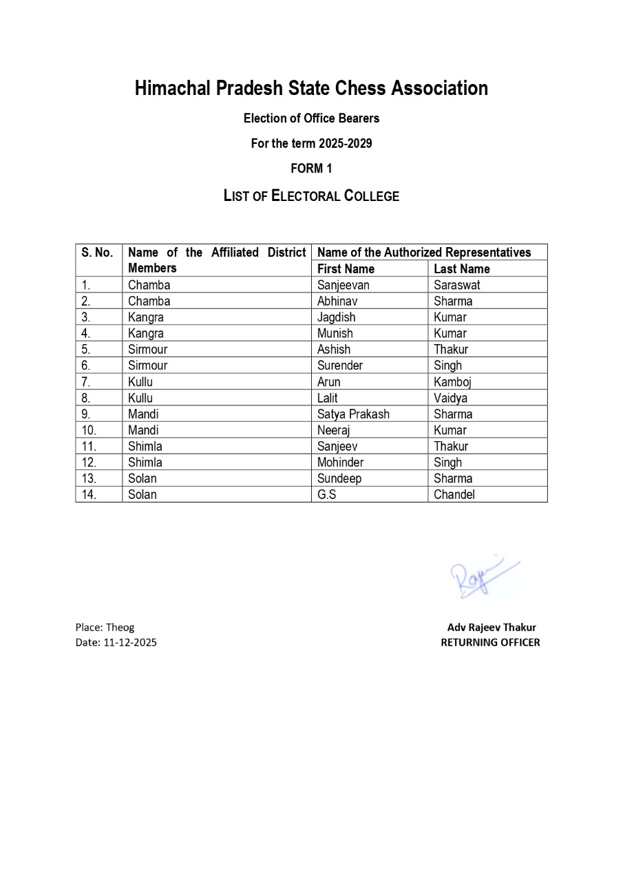 Himachal Pradesh State Chess Association(HPSCA) came into existence on dated 24th July 2007 when it was registered with Regn. No. 26/2007 by its founder members. The President, General Secretary and Cashier at that time were Sh. Sandeep Sharma, Sh. Ashok Bhardwaj and Late Sh. P.S. Khachi. The Registered Head office of the association is situated at Sharma Building, Shalli Bazar Theog, District Shimla. …More